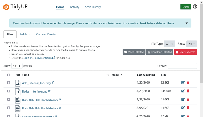 We know removing old and unused files from your course can be a little scary at times, but nothing is easier when it comes to improving your overall course score than purging these old – and often inaccessible - files from your course. Any file in your Canvas course will be scored for accessibility, whether its published or not so to make it easier to locate files that may need to be removed we have a tool integrated into Canvas you can enable into your Canvas course’s navigation menu called TidyUP. This simple tool will scan your Canvas courses for unpublished content and unlinked files and then delete them from your course.
