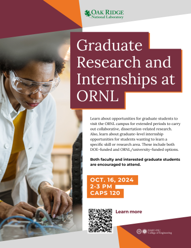 Graduate engineering students and faculty advisors are invited to a presentation given by William Jenks of ORNL’s Office of Research Education to learn about opportunities and mechanisms by which graduate students can come to the ORNL campus for extended periods to carry out dissertation-related research in areas of mutual interest to their major professor and ORNL scientists. These include both DOE-funded and ORNL/university-funded options. Both faculty and interested graduate students are encouraged to attend.